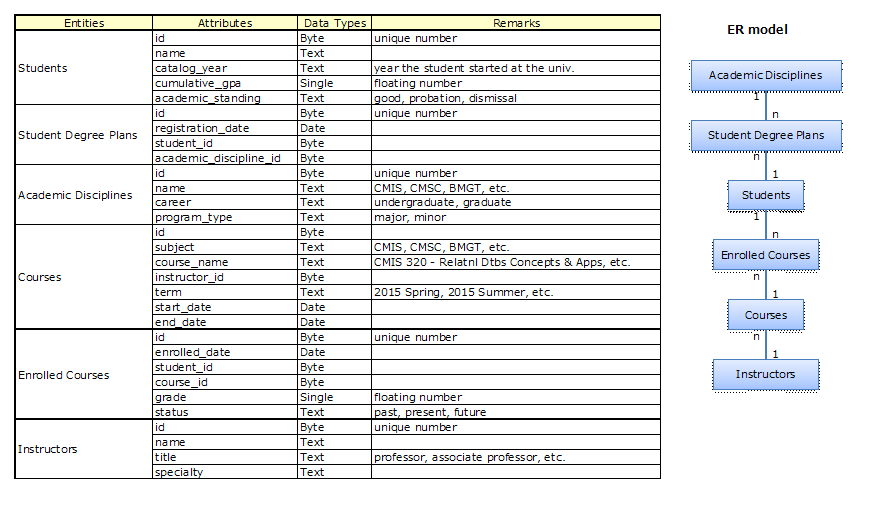 In designing a relational database, each relation needs to be an one-to-many connection. Therefore, I created Enrolled Courses entity between Students entity and Courses entity, and Student Degree Plans entity between Students entity and Academic Disciplines entity in which academic majors and minors are defined.