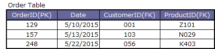 There are three tables: Order, Customer, and Product. The Customer table is in second normal form because it has a transitive dependency of IndustoryID on IndutryName.