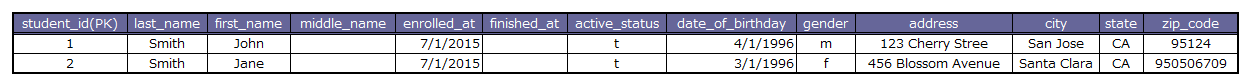 ID FIRST_NAME MIDDLE_NAME LAST_NAME STREET_ADDRESS ZIP_CODE ---------------------- --------------- --------------- --------------- ------------------------------ ---------------------- 1 John D. Smith 123 Cherry Street 95124 2 Jane Smith 456 Blossom Avenue 950506709 3 Myke H. Johnson 789 Flower Street 10007 4 Anne Miller 777 Dream Boulevard 21093 5 Bob Brown 999 Hapiness Avenue 98103 5 rows selected ID CUSTOMER_ID INVENTORY_ID RENTAL_DATE RETURN_DUE_DATE IS_RENTED IS_RETURNED TOTAL_CHARGE TAX ---------------------- ---------------------- ---------------------- ------------------------- ------------------------- --------- ----------- ---------------------- ---------------------- 1 1 1 23-JUN-15 30-JUN-15 f t 2.99 0.3 2 2 4 25-JUN-15 02-JUL-15 t f 2.99 0.3 3 2 4 25-JUN-15 02-JUL-15 t f 0.99 0.1 4 4 9 25-JUN-15 02-JUL-15 f t 2.99 0.3 5 5 13 26-JUN-15 03-JUL-15 t f 2.99 0.3 6 5 13 26-JUN-15 03-JUL-15 t f 0.99 0.1 7 2 16 26-JUN-15 03-JUL-15 f t 2.99 0.3 8 3 17 27-JUN-15 04-JUL-15 t f 2.99 0.3 9 3 17 27-JUN-15 04-JUL-15 t f 0.99 0.1 10 5 21 29-JUN-15 06-JUL-15 t f 2.99 0.3 11 1 22 30-JUN-15 07-JUL-15 t g 2.99 0.3 11 rows selected ID NAME SHIPMENT_QUANTITY ---------------------- ---------------------------------------- ---------------------- 1 A Corporation 500 2 B Inc. 250 3 C LLC. 150 3 rows selected 1 rows updated