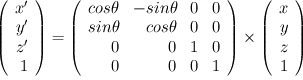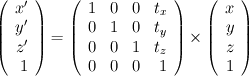 Provide the 4x4 matrices in row,column format for a set of Geometric transformations that include 30 degree rotation, translation of 50 in x direction and -100 in y direction, and with a scaling of 1.5 applied in both the x and y directions.